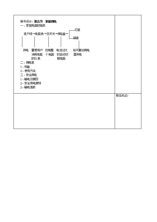 重 点:家庭电路的组成及连接,各部分的作用,安全用电常识。