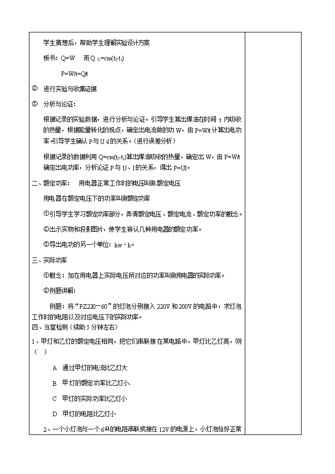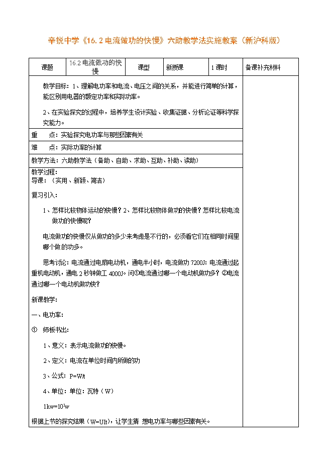辛锐中学《16.2电流做功的快慢》六助教学法实施教案(新沪科版)