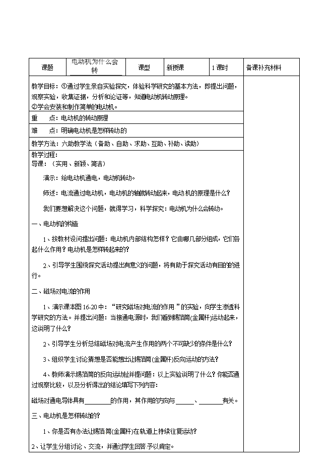 教学目标:①通过学生亲自实验探究,体验科学研究的基本方法,即提出问题,观察实验,收集证据,分析和论证等,知道电动机转动原理。