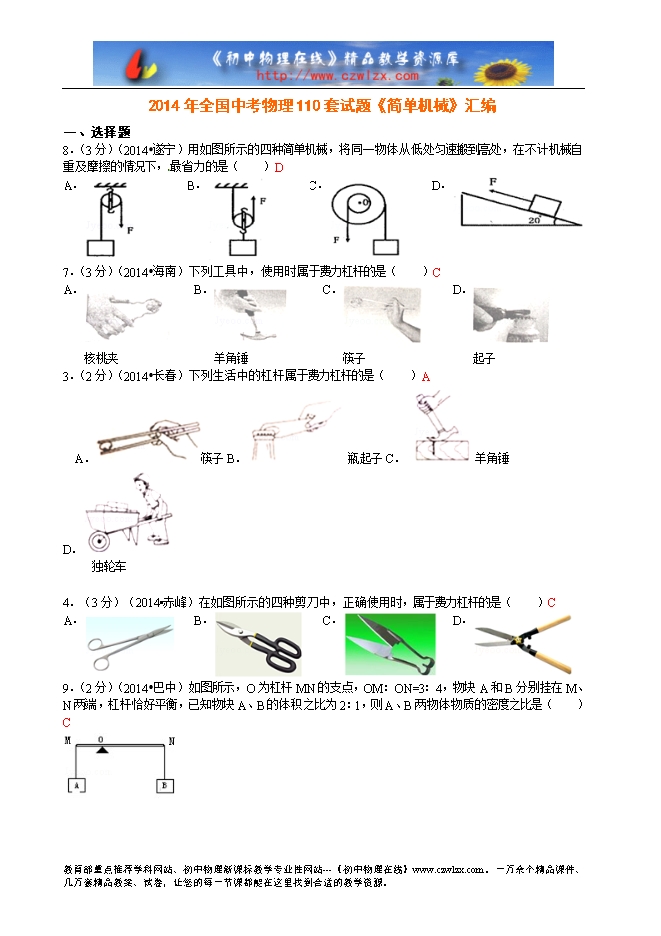 7.(3分)(2014?海南)下列工具中,使用时属于费力杠杆的是( )C