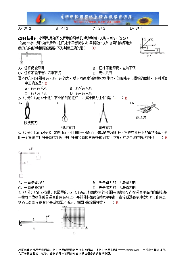 2.(3分)(2014?十堰)下图所列的杠杆中,属于费力杠杆的是( )B