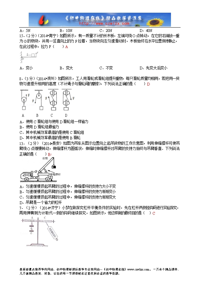5.(2分)(2014?绥化)如图所示,小明用一可绕O点转动的轻质杠杆,将挂在杠杆下的重物提高,他用一个始终与杠杆垂直的力F,使杠杆由竖直位置缓慢转到水平位置,在这个过程中此杠杆( )B:
