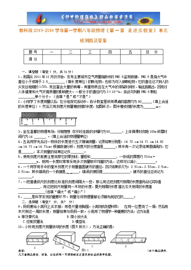 教科版2013-2014学年第一学期八年级物理《第一章 走进实验室》单元检测题及答案