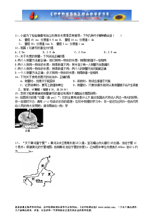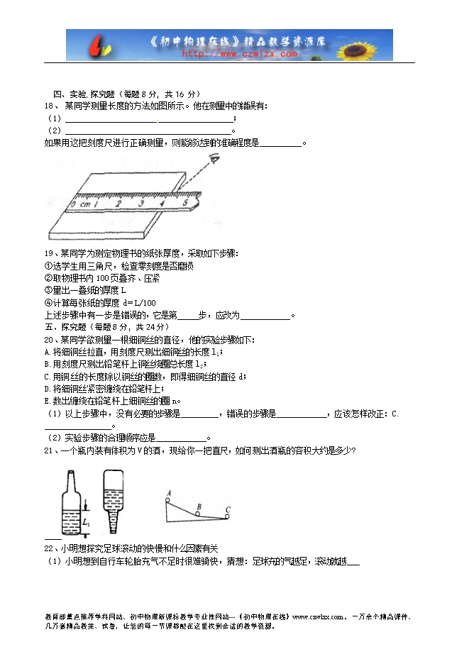 8、 是科学发现的重要环 节。测量任何物理量都必须首先规定它的 。二、选择题(每空? 分,共? 分)