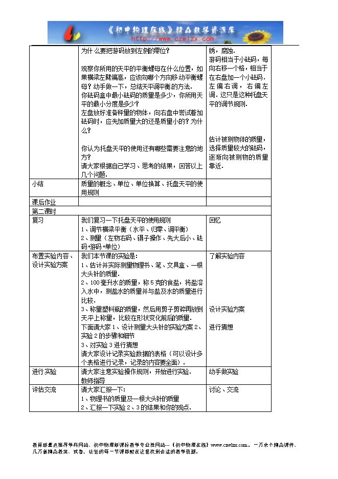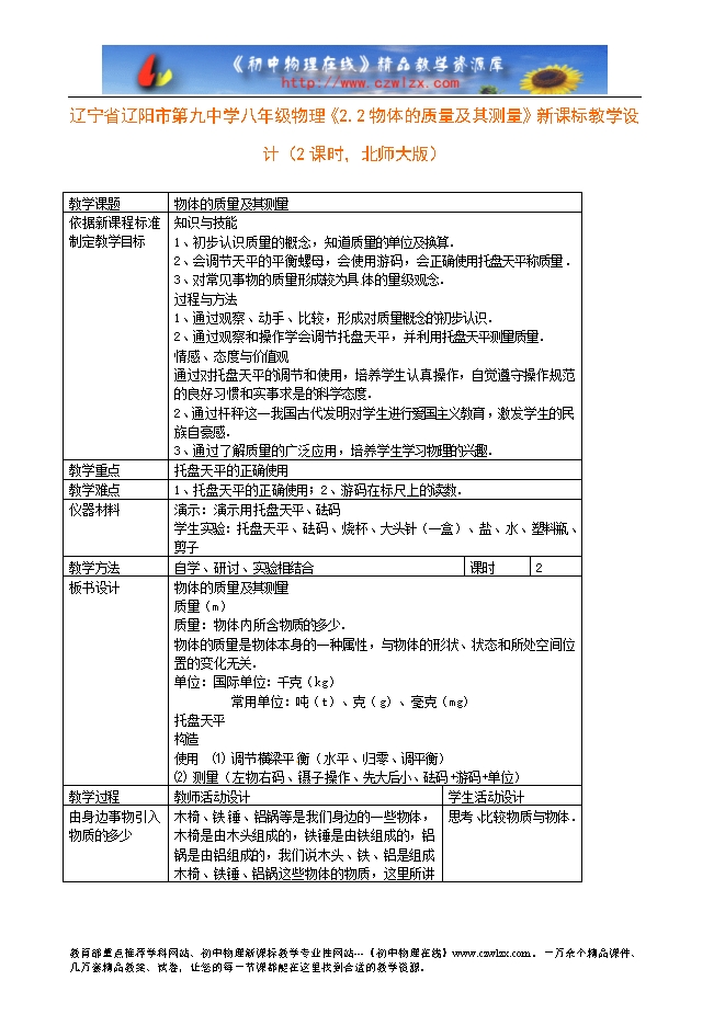 辽宁省辽阳市第九中学八年级物理《2.2物体的质量及其测量》新课标教学设计(2课时,北师大版)