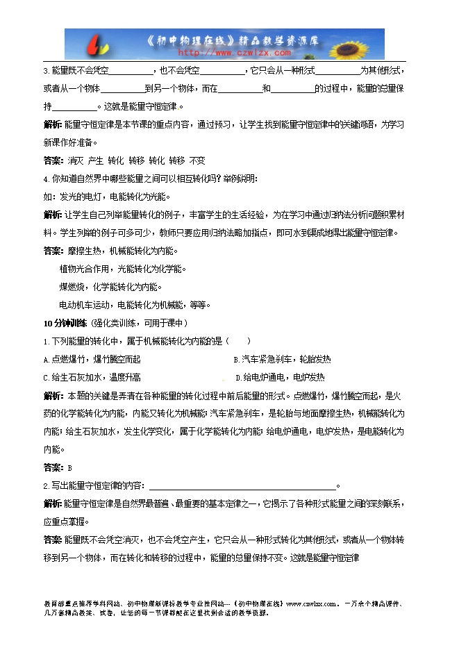 解析:能量守恒定律是本节课的重点内容,通过预习,让学生找到能量守恒定律中的关键词语,为学习新课作好准备。