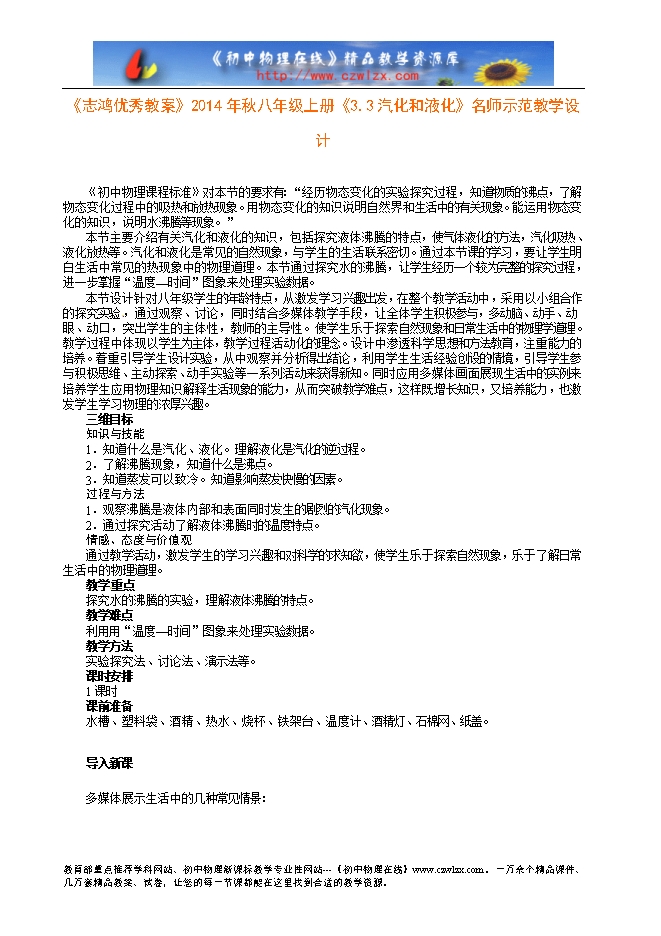 《志鸿优秀教案》2014年秋八年级上册《3.3汽化和液化》名师示范教学设计
