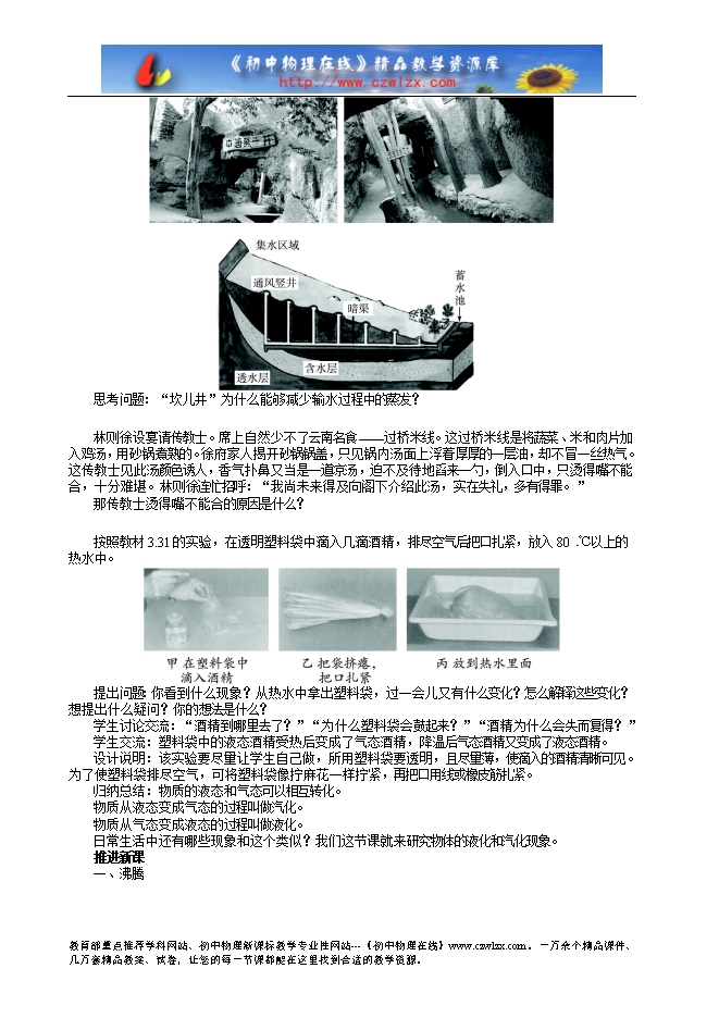 水槽、塑料袋、酒精、热水、烧杯、铁架台、温度计、酒精灯、石棉网、纸盖。教学过程