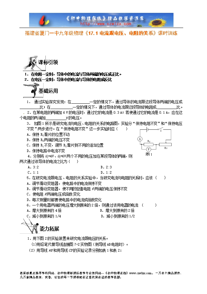 福建省厦门一中九年级物理《17.1电流跟电压、电阻的关系》课时训练