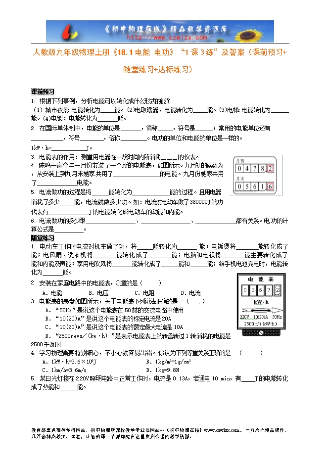 人教版九年级物理上册《18.1电能 电功》“1课3练”及答案(课前预习+随堂练习+达标练习)