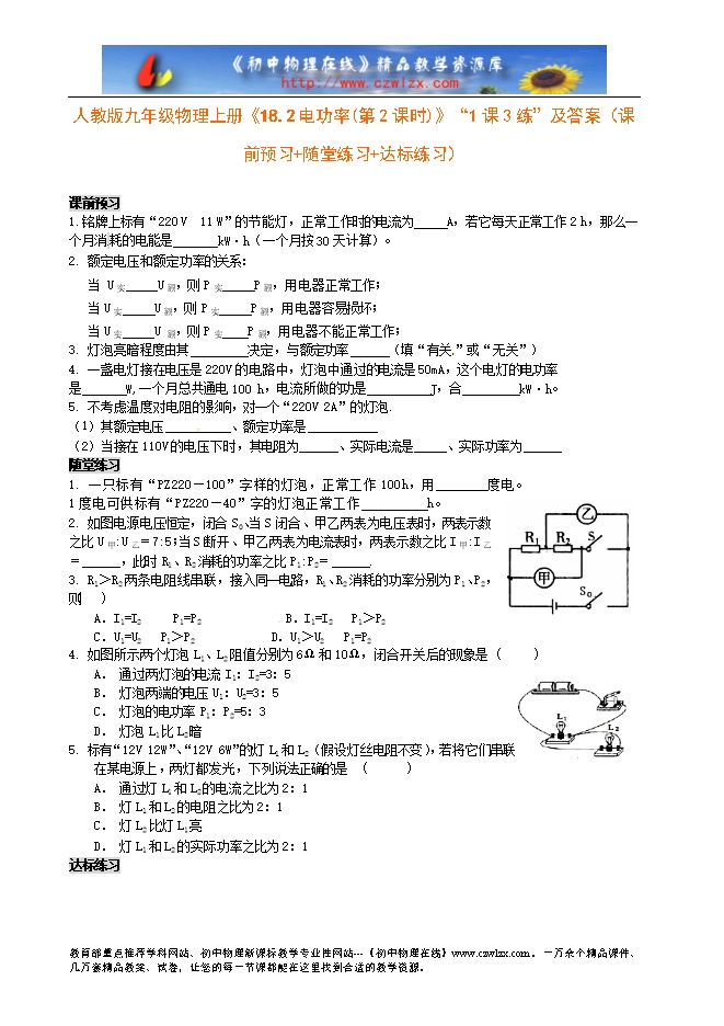 人教版九年级物理上册《18.2电功率(第2课时)》“1课3练”及答案(课前预习+随堂练习+达标练习)