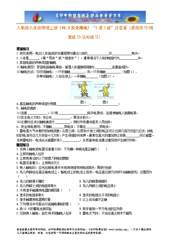 人教版九年级物理上册《19.3安全用电》“1课3练”及答案(课前预习+随堂练习+达标练习)