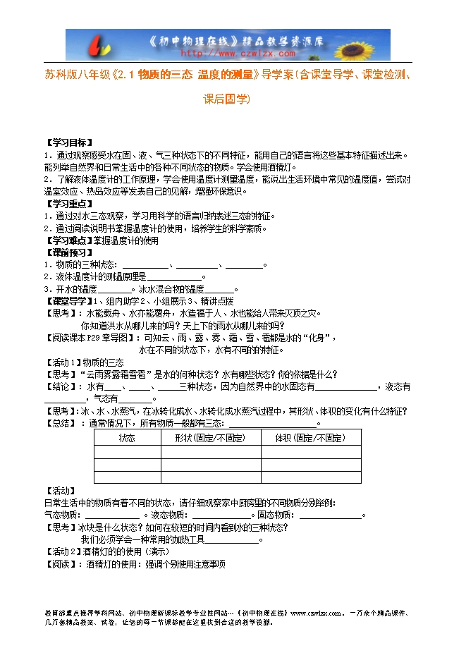 苏科版八年级《2.1物质的三态 温度的测量》导学案(含课堂导学、课堂检测、课后固学)