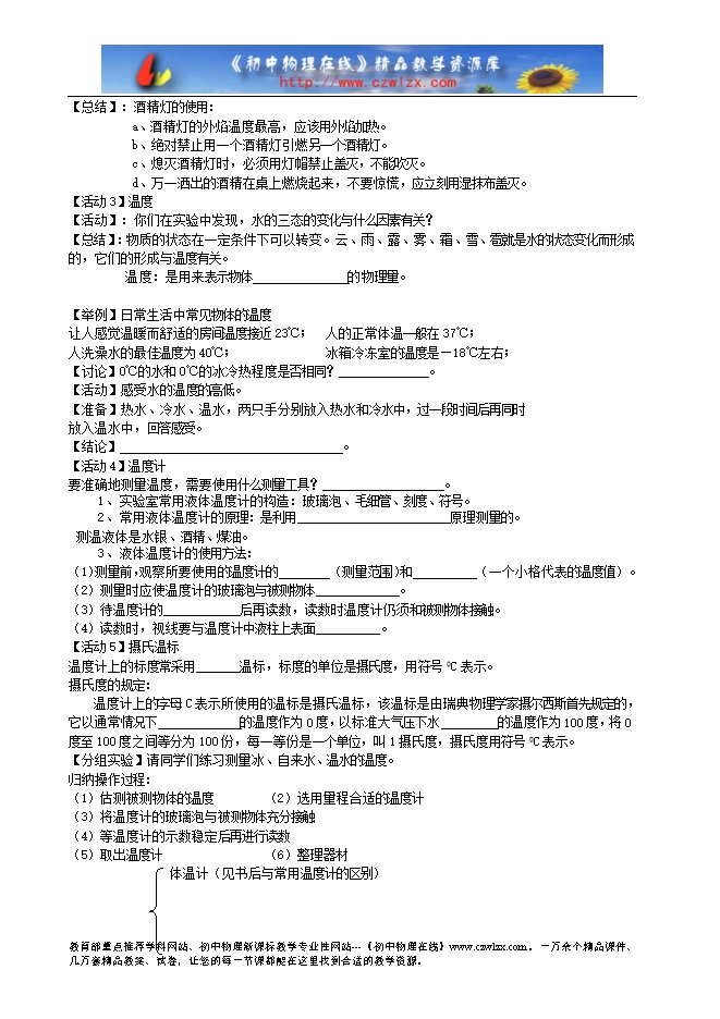 1.通过观察感受水在固、液、气三种状态下的不同特征,能用自己的语言将这些基本特征描述出来。能列举自然界和日常生活中的各种不同状态的物质。学会使用酒精灯。