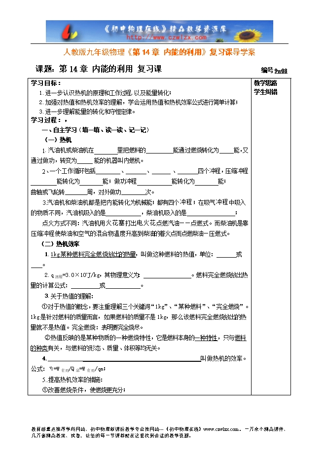 人教版九年级物理《第14章 内能的利用》复习课导学案