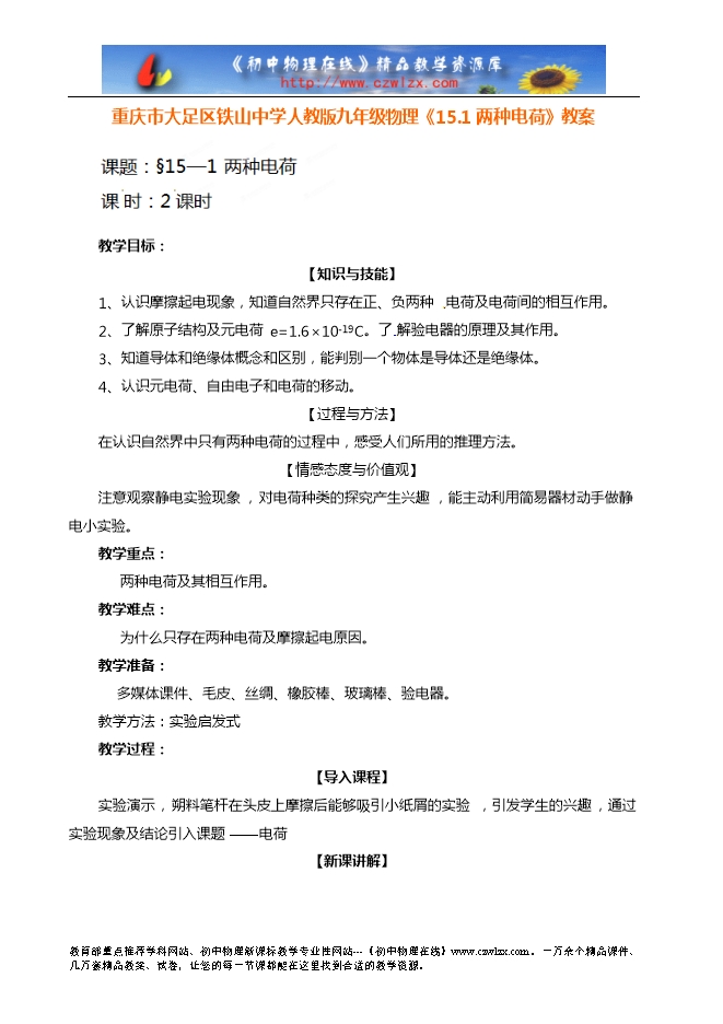 重庆市大足区铁山中学人教版九年级物理《15.1两种电荷》教案