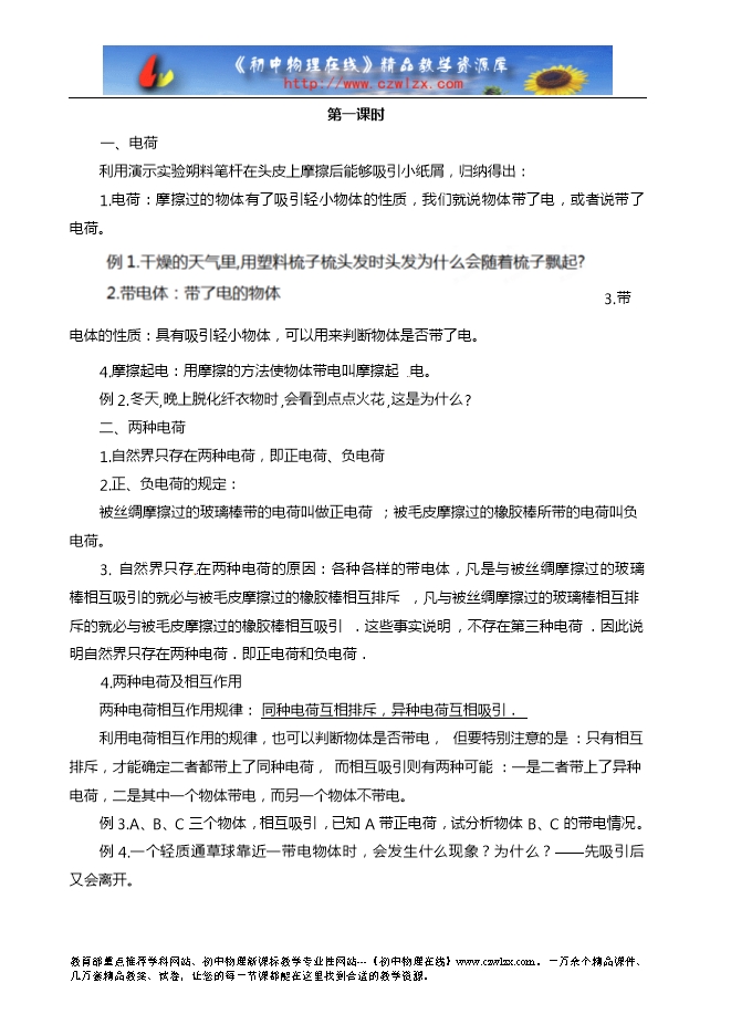 1.电荷:摩擦过的物体有了吸引轻小物体的性质,我们就说物体带了电,或者说带了电荷。