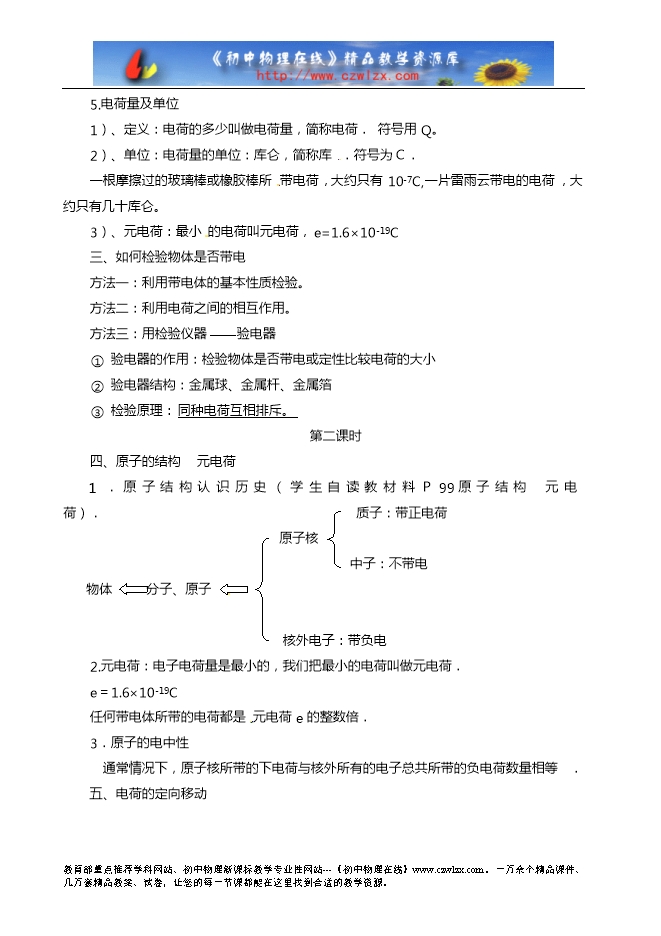 2、了解原子结构及元电荷e=1.6×10-19C。了 解验电器的原理及其作用。