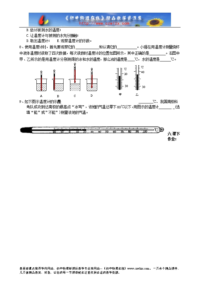 (2)测量时将温度计的 全部浸入被测液体中, 碰到容器和侧壁。