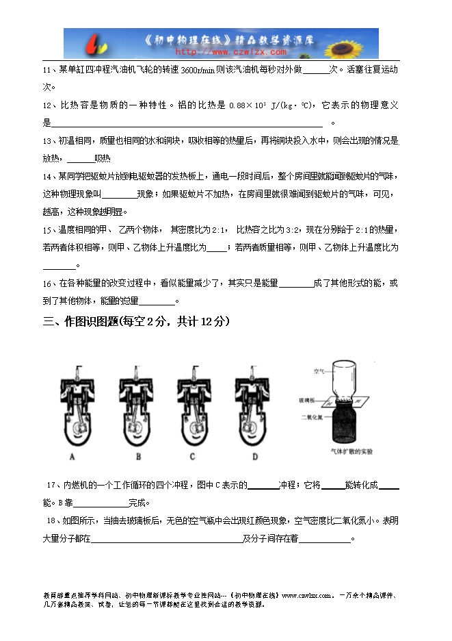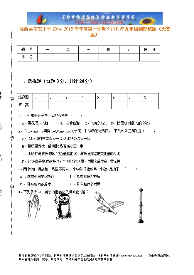 陇西县南安中学2014-2015学年度第一学期9月月考九年级物理试题(无答案)