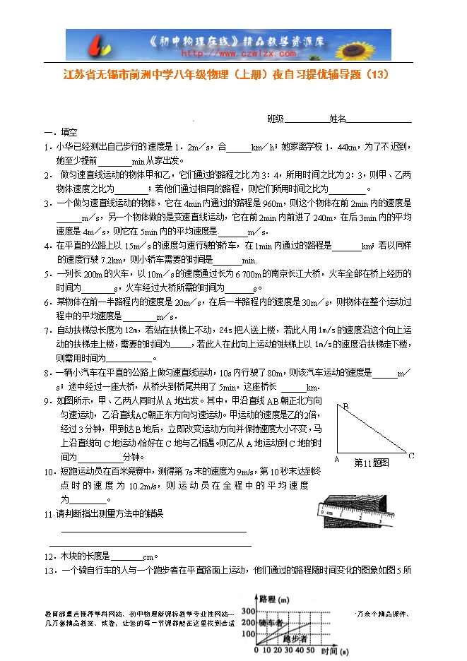 江苏省无锡市前洲中学八年级物理(上册)夜自习提优辅导题(13)