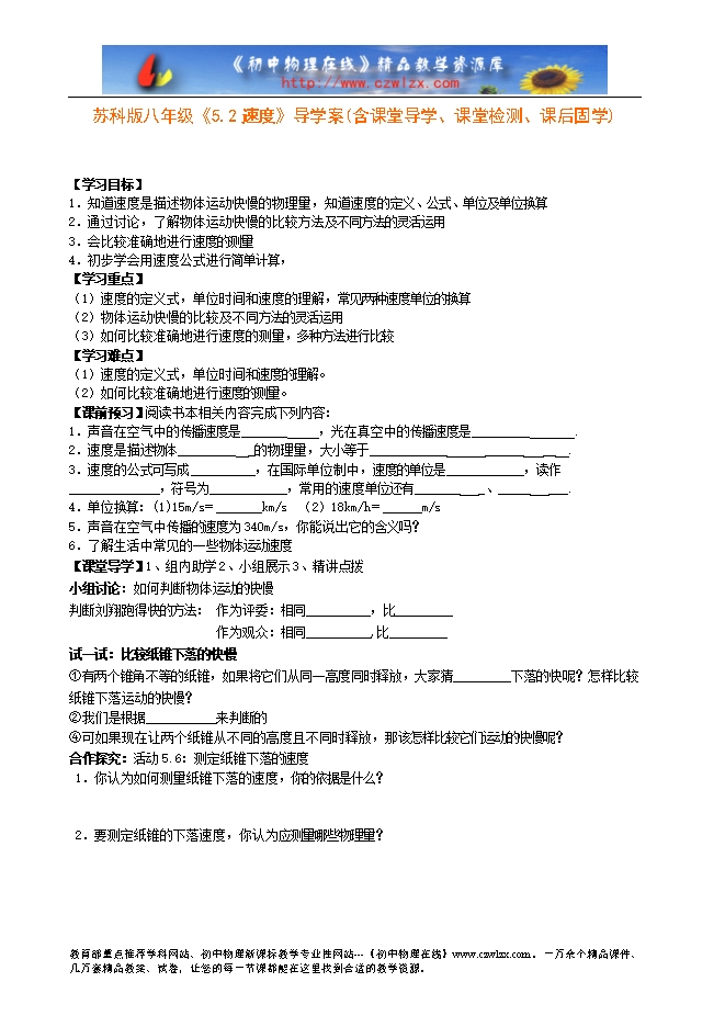 苏科版八年级《5.2速度》导学案(含课堂导学、课堂检测、课后固学)