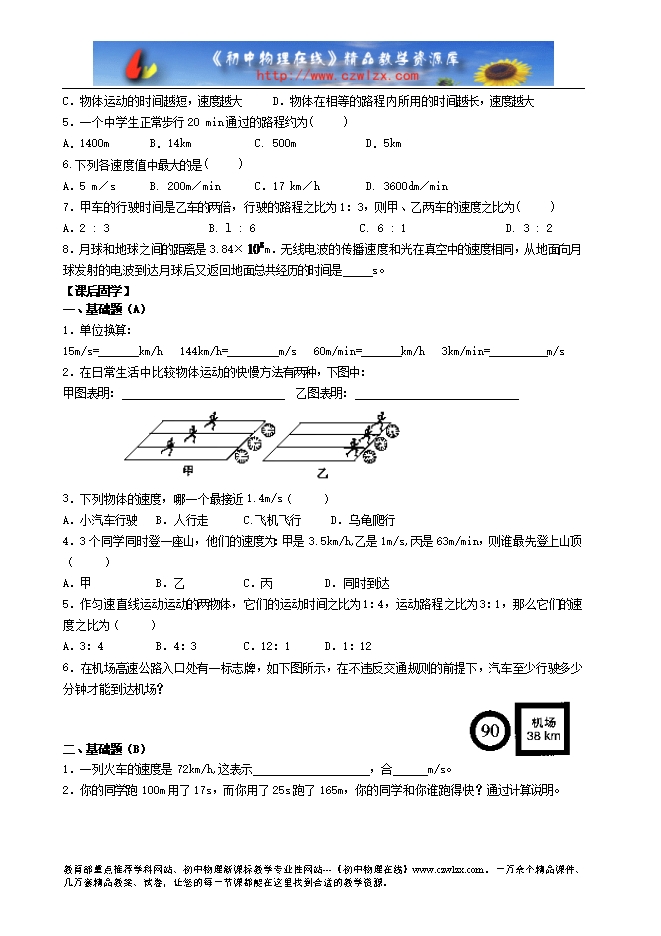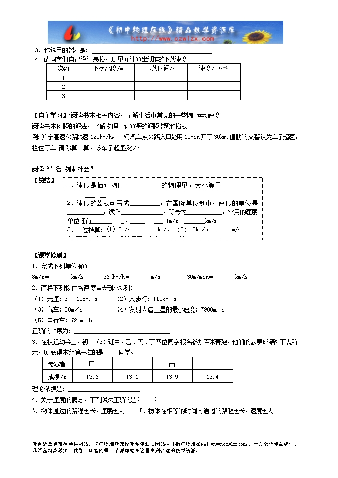 3.速度的公式可写成__________,在国际单位制中,速度的单位是____________,读作______________,符号为____________,常用的速度单位还有_______ _、_____ ___.