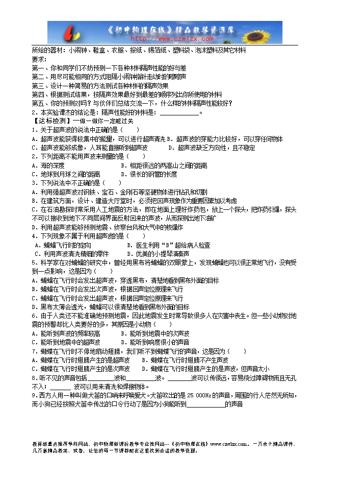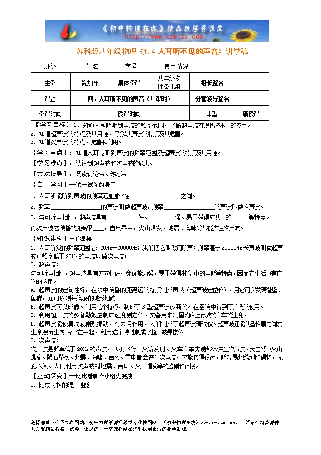 【内容简介】【学习目标】:1.知道人耳能听到声波的频率范围,了解超声波在现代技术中的应用。