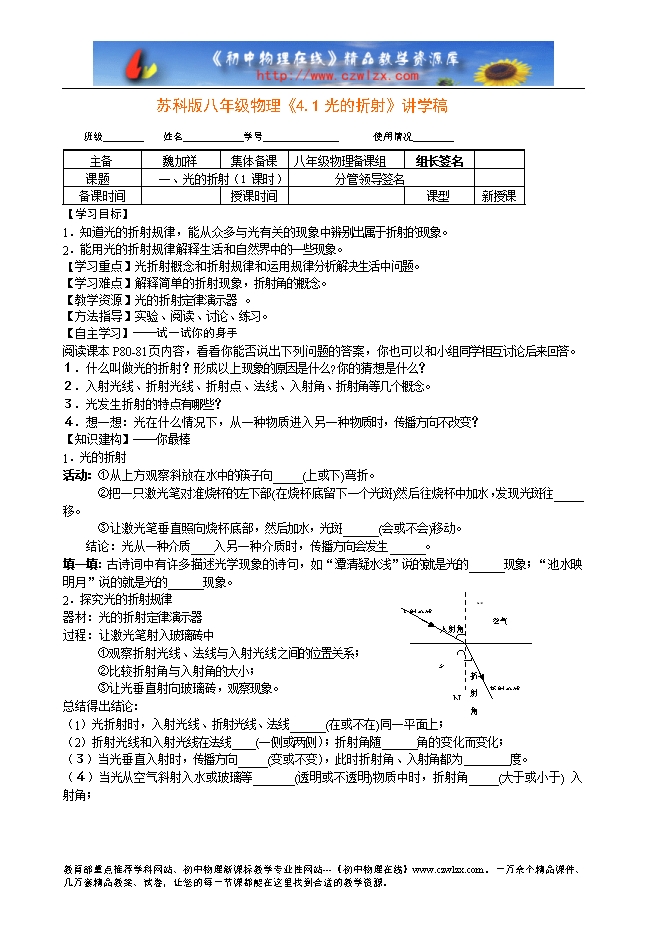 2.能用光的折射规律解释生活和自然界中的一些现象。