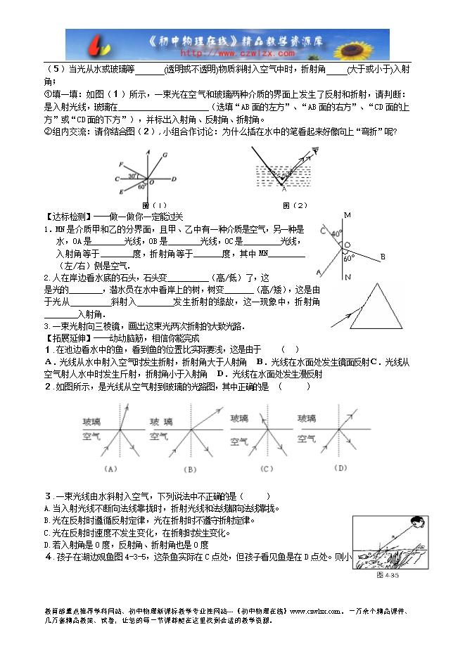 2.入射光线、折射光线、折射点、法线、入射角、折射角等几个概念。