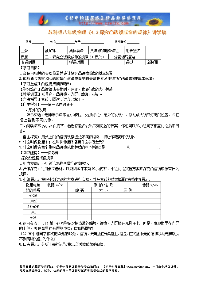 苏科版八年级物理《4.3探究凸透镜成像的规律》讲学稿