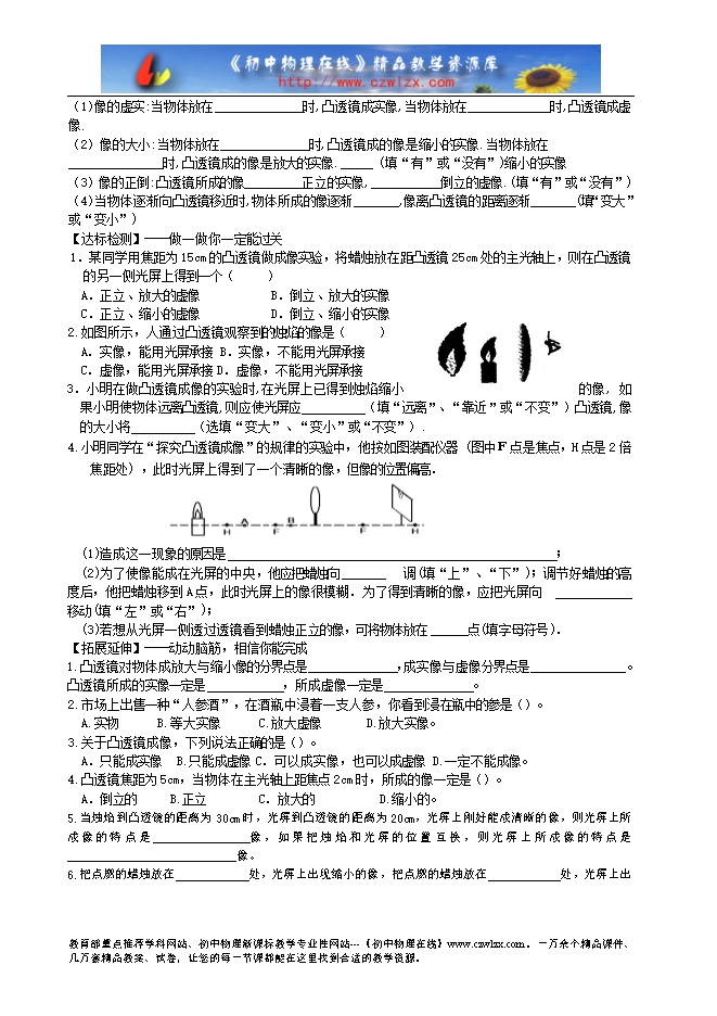 【教学资源】光具座、凸透镜、光屏、蜡烛、火柴 。