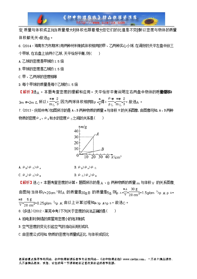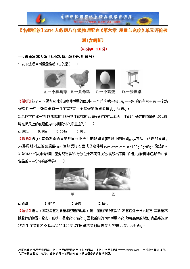 【名师推荐】2014人教版八年级物理配套《第六章 质量与密度》单元评价检测(含解析)