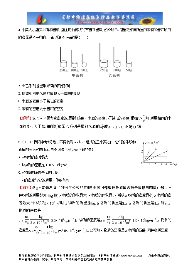 【解析】选D。本题考查密度的理解和应用。米酒的密度小于酱油的密度,根据V= 知,质量相同的米酒的体积大于酱油的体积,故图乙系列是量取米酒的系列,故A、B、C正确,D错。