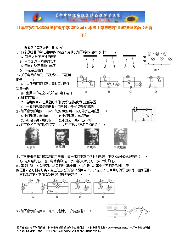4、在下图所示的四位科学家中,以其名字命名电阻单位的是( )