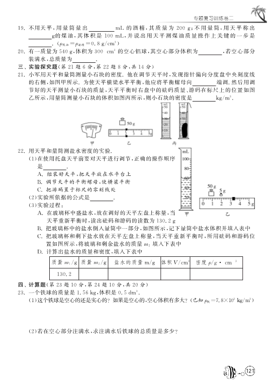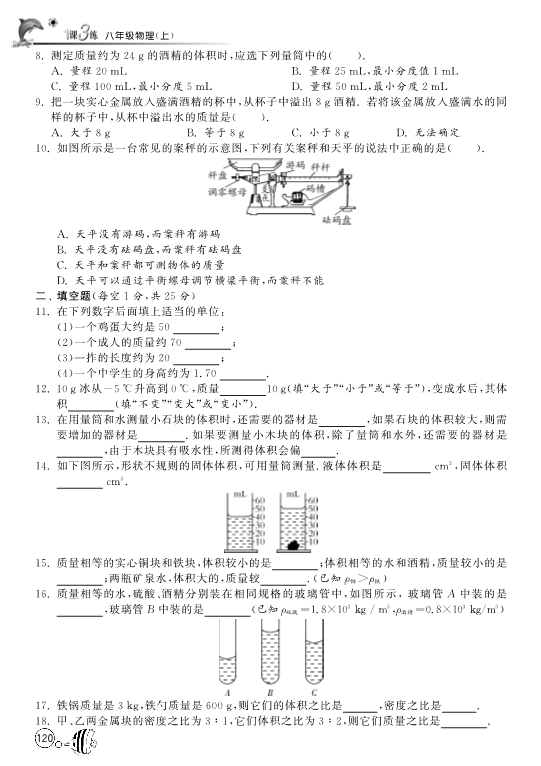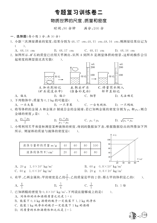 【1课3练】北师大版八年级物理《第二章 物质世界的尺度、质量和密度》专题复习训练卷(pdf版)