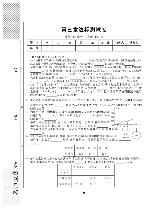 【1课3练】北师大版八年级物理《第三章 物质的简单运动》达标测试卷(pdf版)