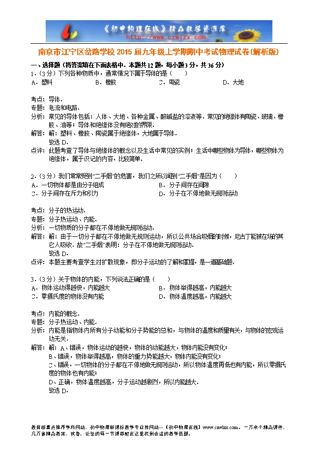 - 12302014秋九年级第一学期期中物理重点题练习及答案(word版,共21页)