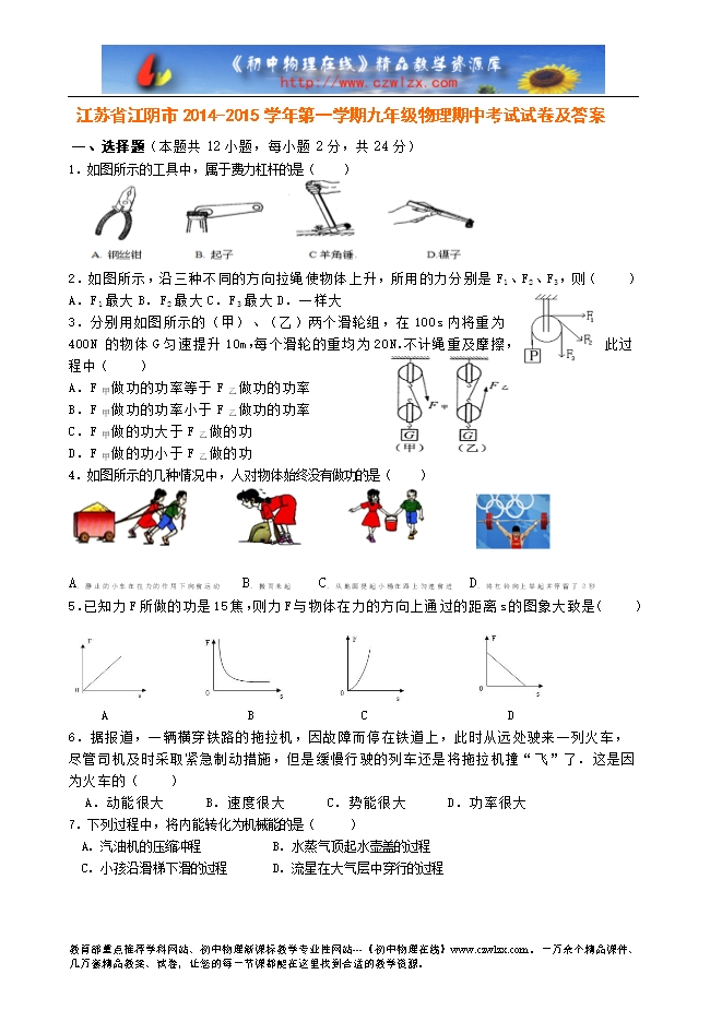 江苏省江阴市2014-2015学年第一学期九年级物理期中考试试卷及答案