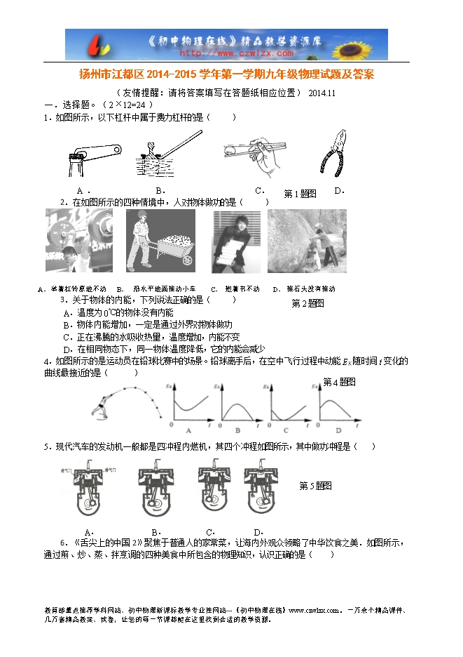 扬州市江都区2014-2015学年第一学期九年级物理试题及答案