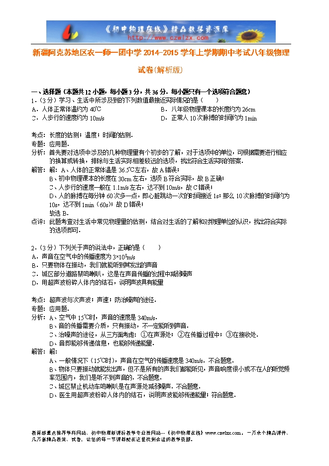 新疆阿克苏地区农一师一团中学2014-2015学年上学期期中考试八年级物理试卷(解析版)