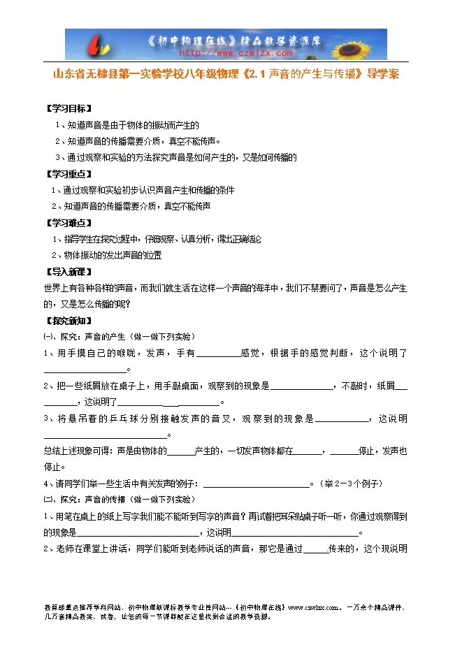 山东省无棣县第一实验学校八年级物理《2.1声音的产生与传播》导学案