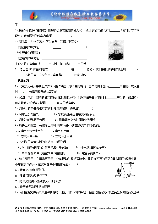 4、请同学们举一些生活中有关发声的例子: 。(举2—3个例子)