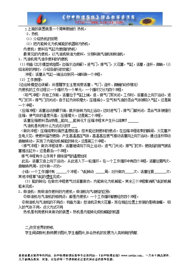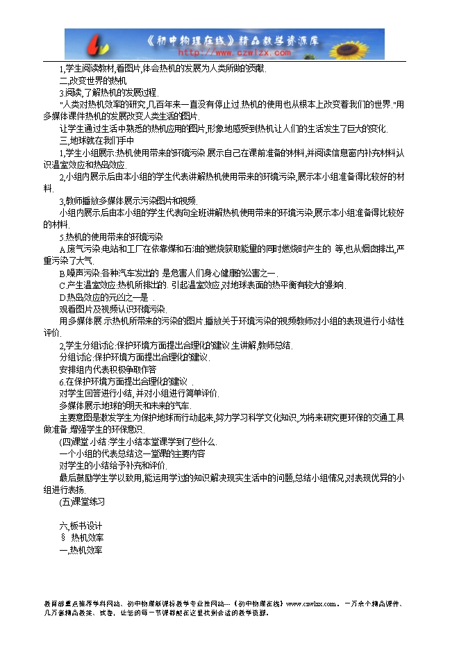 教学难点:理解环境污染与热机使用的关系;热机效率的运用;教学过程: