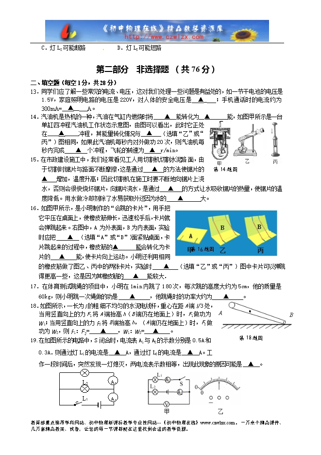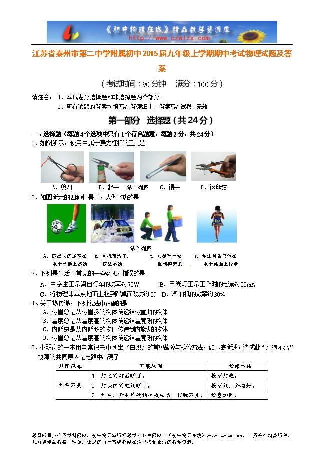 江苏省泰州市第二中学附属初中2015届九年级上学期期中考试物理试题及答案