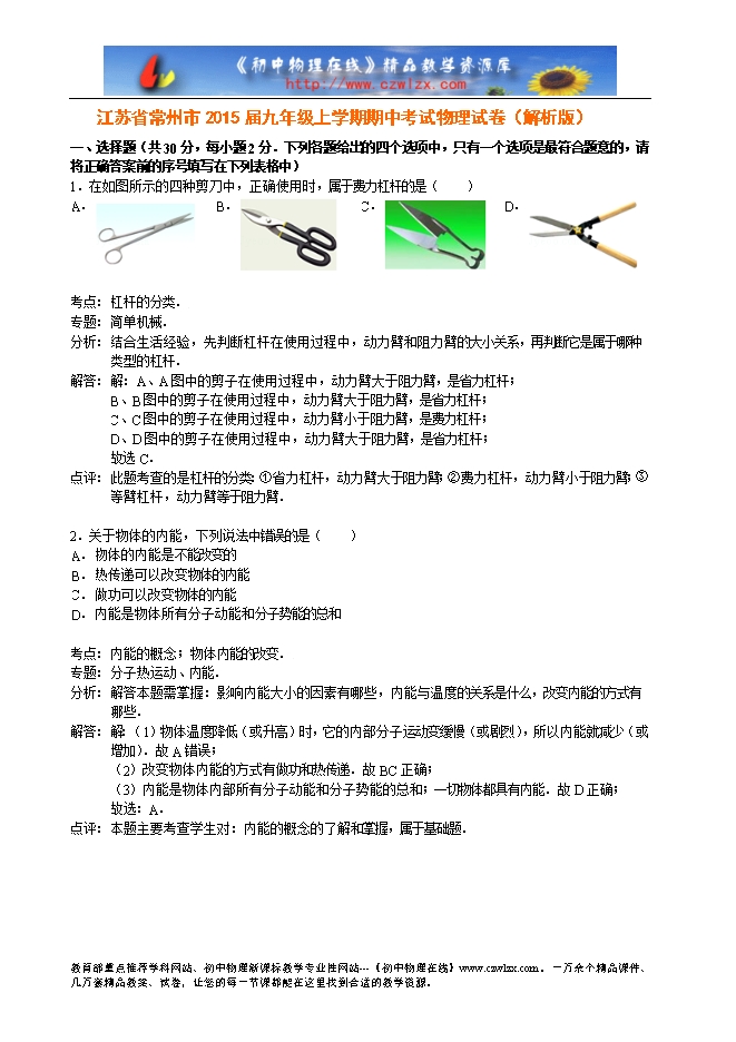 江苏省常州市2015届九年级上学期期中考试物理试卷(解析版)