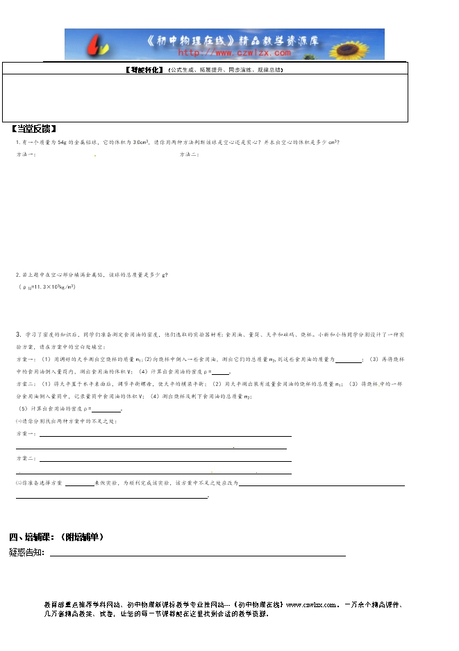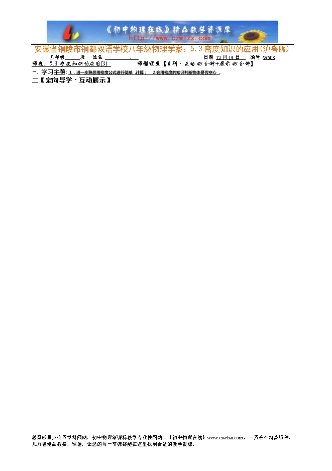 【内容简介】课题:5.3密度知识的应用(3) 课型设置【自研?互动45分钟+展示45分钟】