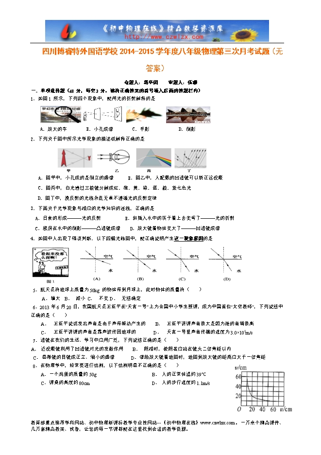 四川博睿特外国语学校2014-2015学年度八年级物理第三次月考试题(无答案)