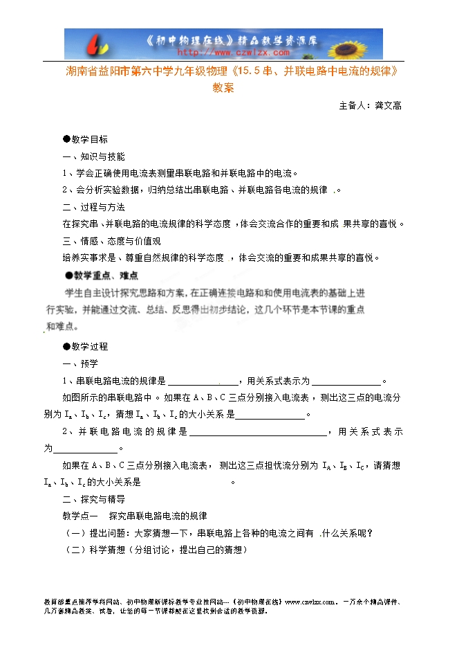 湖南省益阳市第六中学九年级物理《15.5串、并联电路中电流的规律》教案