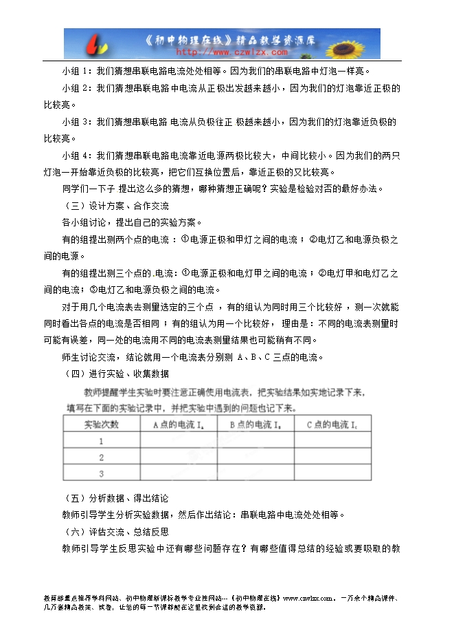(一)提出问题:大家猜想一下,串联电路上各种的电流之间有 什么关系呢?